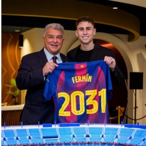 开云-续约完成!巴萨官推晒费尔明与拉波尔塔合照,手持2031号码球衣